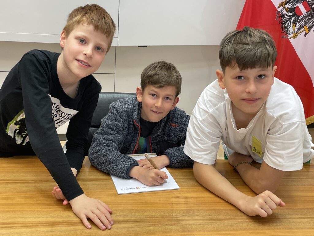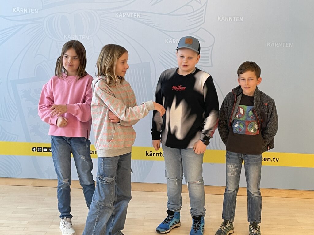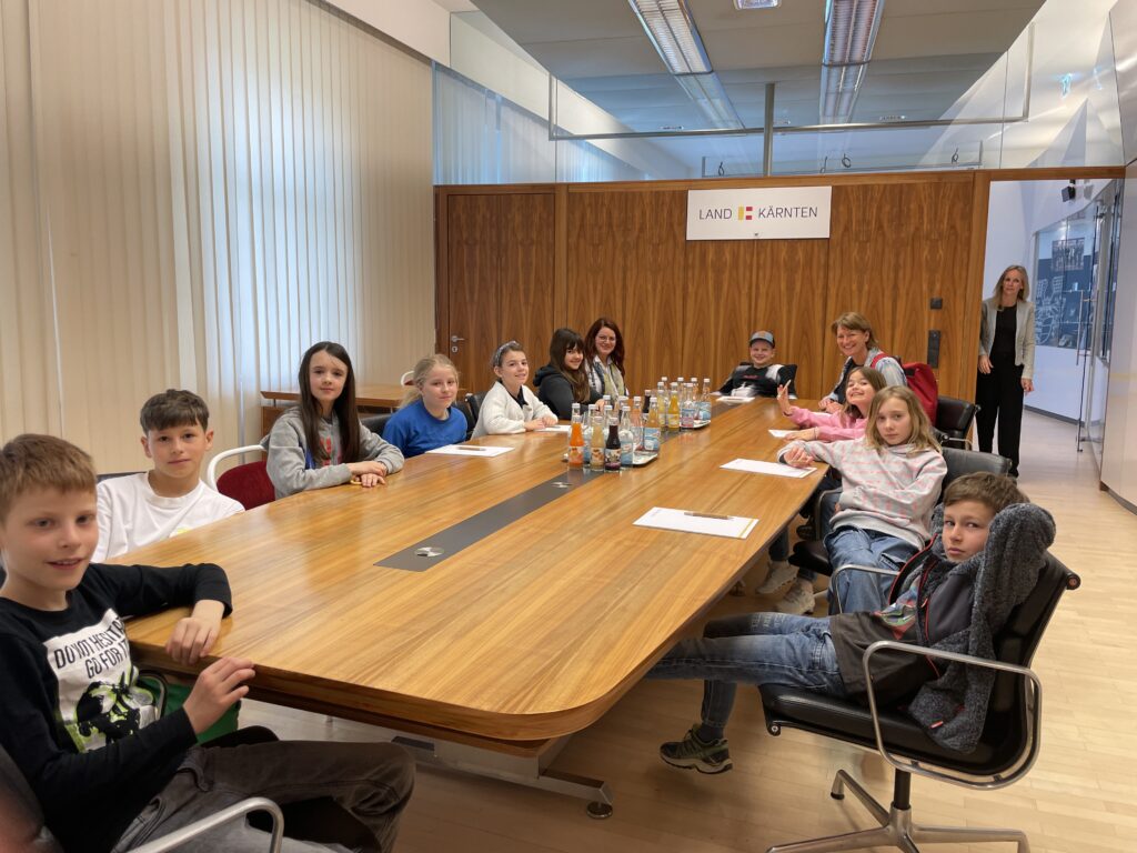 Wir nutzten wie immer die öffentlichen Verkehrsmittel und starteten in Steindorf am Bahnhof. Wir fuhren mit dem Zug über St. Veit nach Klagenfurt. Nach einem kurzen Fußmarsch trafen wir bei der Landesregierung ein und kamen in den Genuss einer Führung durch das Gebäude. Im Spiegelsaal wurden wir von Herrn Landesrat Ing. Fellner Daniel empfangen und lauschten angespannt seinen Ausführungen und interessanten Geschichten rund um die Landesregierung. Zu großer Freude aller kam auch unser Landeshauptmann Dr. Peter Kaiser auf einen Kurzbesuch bei uns vorbei und lobte sehr die politischen Kenntnisse unserer Kinder. Nach einer tollen Jause (die „Schnitzelsemmeln“ waren der HIT) verließen wir wieder die Landesregierung und marschierten zum Bahnhof, wo wir mit dem Zug Richtung Villach und mit dem Bus Richtung Ossiach fuhren!