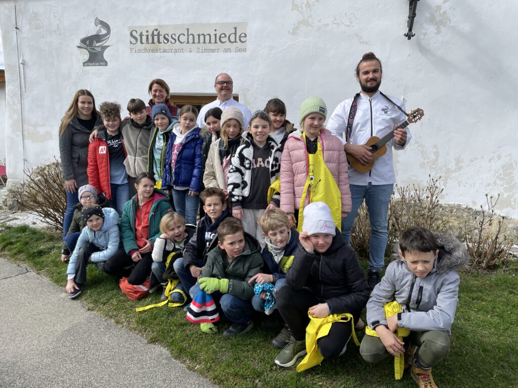 Es gab Biobackhendl und Seeforelle mit Petersilkartoffel und Schmorgemüse, sowie selbst gebackenes Brot. Die Kinder durften alles selbst zubereiten. Angefangen mit dem Schneiden von Gemüse, über Panieren der Hendlstücke und Filetieren des Fisches. Neben interessanten Informationen über Fisch, Fleisch und Brot erfuhren die Schülerinnen und Schüler auch Geschichtliches über die Stiftsschmiede. Herr Satran und sein Sohn Florian brachten den Kindern sehr kindgemäß, lustvoll und nachhaltig viele Dinge über unsere wertvollen Lebensmittel und deren Verarbeitung bei.